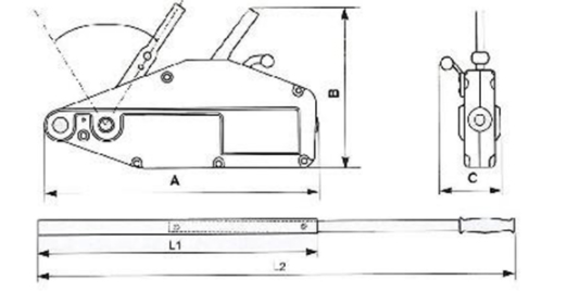 額定起重量(KG) | 額定收拉力N | 額定前進行程 | 鋼絲繩直徑(mm) | 鋼絲繩安全系數 | 整機安全系數 | 最大載荷(KG) | 整機重量(KG) | 整機尺寸 | L1(mm) | L2(mm) | ||||||