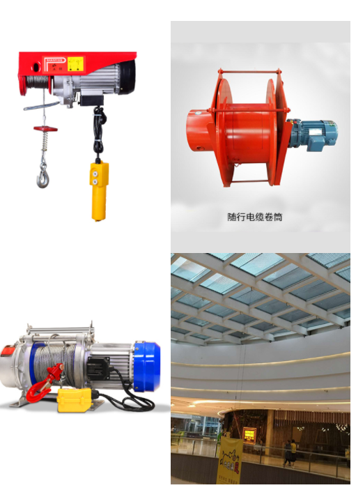 商場用電動提升機(jī):現(xiàn)在每個(gè)商場基本都會使用商場廣告吊鉤,而這些廣告吊鉤大多是安裝在商場中庭邊緣的,通過導(dǎo)向輪把鋼絲繩引導(dǎo)過去然后垂下吊鉤,這樣在需要更換條幅的時(shí)候就只要輕輕一按,就可以放下吊鉤更換條幅了。