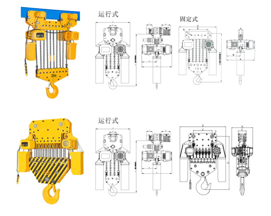 | 運(yùn)行式環(huán)鏈電動(dòng)葫蘆(7.5T-50T)尺寸參數(shù): | ||||||||